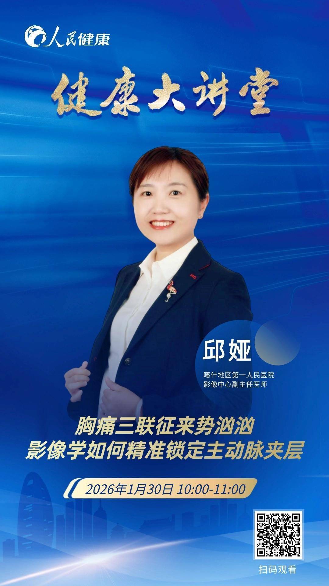 1月30日10:00至11:00,喀什地区第一人民医院影像中心副主任医师邱娅做客演播室,和大家一起聊聊“影像学如何精准锁定主动脉夹层”的话题,欢迎届时收看。